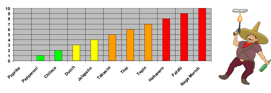 Alla: tunnettujen lajikkeiden tyypillisiä tulisuuksia. Asteikko ei ole lineaarinen, vaan esim. 10 voi olla 2 kertaa 9:ää tulisempi. Yksilöerot ovat jo kasvatuspaikan olosuhteiden vuoksi melkoisia, eli kuvioon kannattaa suhtautua vain suuntaa antavana.